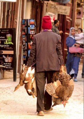 Et kana on kõige igapäevasem liha Maroko toidulaual, siis parimate lettide juures on turul alati saginat. Tagine’i võib vabalt valmistada ka muust lihast, mis rikkamates ja Euroopast enam mõjutust saanud linnades kombeks, või kalast, mis ookeani ääres lihtsamalt kätte tuleb, või siis berberite kombel ainult köögiviljadest. Turult saab kõike, ehkki paari kallimat lamba- või veiseliha pakkuva müüja leti juures on elu rahulikum ja kala järel käiakse turul vaid sisemaal. Rannikul minnakse sadamasse hommikul kella kümne paiku, kui kalapaadid merelt tulevad.