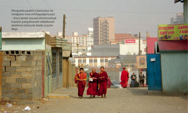 Reisi viimase päeva veetsime Ulaanbaataris. Mongoolia pealinn on intrigeeriv oma mitmepalgelisuses – linna keskel asuvad ultramoodsad klaasist pangahooned vahelduvad äärelinna tolmuste teede ja jurtadega. Üldine linnapilt meenutab oma auklike tänavate ja kõn- niteedega 15 aasta tagust Kesk-Venemaa linna. Kohati ilmestavad linna üksikud budistlikud templid. Linna keskele on koondunud kõikvõimalikud turistidele mõeldud toitlustusasutused alates iiri pubist ja lõpetades mehhiko restoraniga. Rõõmu teeb hinnatase – näiteks 0,5 l vaadiõlut maksab baaris 18 krooni. Kohalikud inimesed on abivalmid, kuid veidi tagasihoidlikud ja sõnaahtrad.