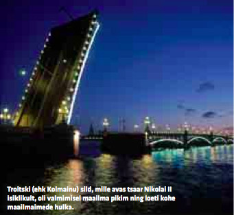 Eiffeli torni kui inetuse sümboli vastu sõdis kogu Pariisi koorekiht ja intelligents ning nõudis selle lammutamist. Troitski (ehk Kolmainu) sild, mille avas tsaar Nikolai II isiklikult, oli valmimisel maailma pikim ning loeti kohe maailmaimede hulka. Silla alguses sirguvate Rostra sammaste autoriks on pealegi meie Amandus Adamson. Kui teistel lahtikäivatel sildadel avaneb ülespoole kaks, siis Troitski sillal ainult üks tohutu suur klapp, mis lisab elegantsust.