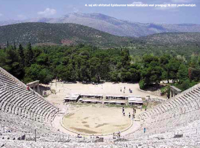 See kõige paremini säilinud teater Kreekas (ehitatud 4. saj eKr) mahutab veel praegugi 16 000 pealtvaatajat. Juulis-augustis toimuva teatrifestivali ajal on võimalik nautida suurte dramaturgide Aischylose, Sophoklese ning Euripidose igikestvat loomingut. Kuid ennemuiste lavastati Epidaurose teatris just Asklepiosega seotud müsteeriume, pidades loomulikult silmas terapeutilisi eesmärke. Pärast etendust jalutas publik imeilusatel nõlvadel.