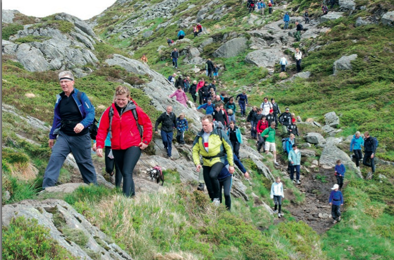Matka alguspunktist Gravdalist asusime teele kell 7.45 (võinuks ka varem, sest kontrollpunktid avatakse kell 7). Esimene mägi, Lyderhorn (396 m), oli päris hea sissejuhatus – vahelduv maastik, rõõmus meeleolu, kuiv ilm. Tõus, millele normaalsetes tingimustes (s.o vähemate matkajatega) kuluks 30–45 minutit, võttis nüüd tunniajase järjekorras seismise tõttu kolm korda rohkem aega (1 t 45 min).