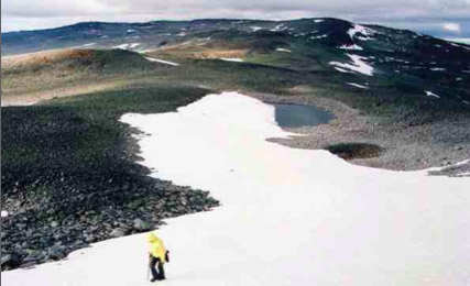 900 ja 1000 meetri vahel tuleb üles ronida kõikuvatest kivilahmakatest koosnevast võrdlemisi järsust nõlvast. Edasi läheb tõus laugemaks, kuid ega jalgealune sellepärast siledamaks ja kindlamaks lähe. Küsimus on pigem või võimalikult optimaalse tee valikus. Jätkuvalt on maapind kaetud erinevas suuruses kividega, mis pole sugugi kenasti üksteise kõrvale laotud, vaid risti-rästi üksteise peal. Suuremad lahmakad tunduvad esialgu üsna turvaliste ja mõnusatena, kuni järjekordne ootamatu „pääsuke“ või polkasamm „kiigelaual“ taas korrale kutsub. Vähegi tasasemaid sambla- ja samblikulaike on üksikuid; ainsat kergendust jalale pakuvad tihkeks sulanud lumelaigud.