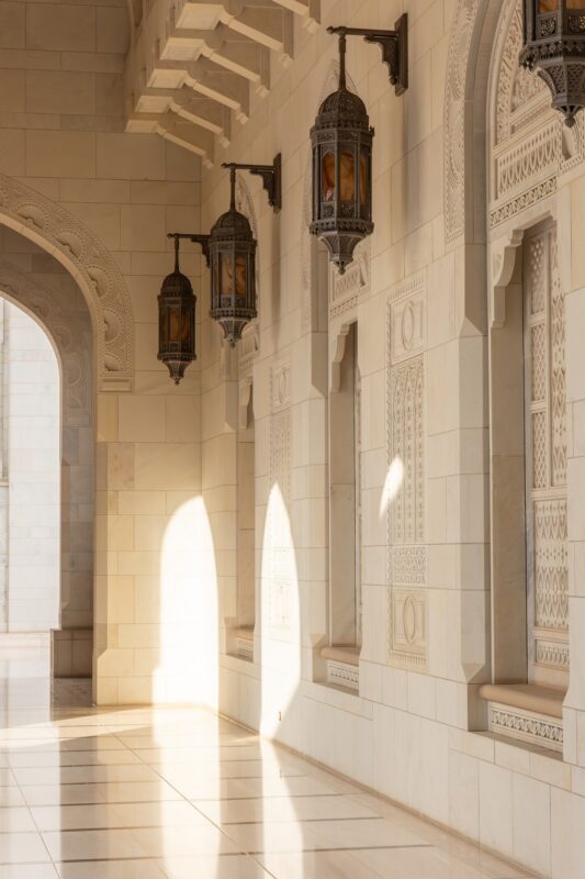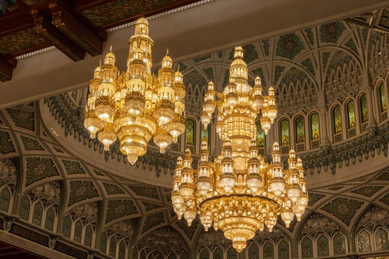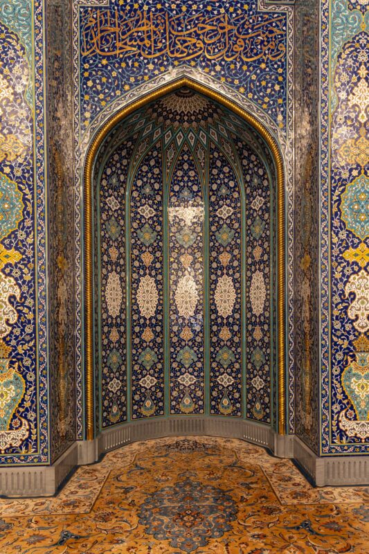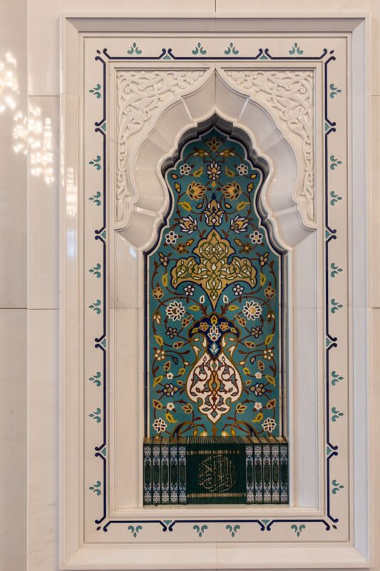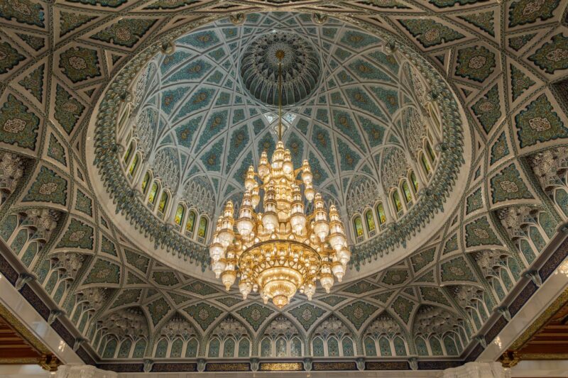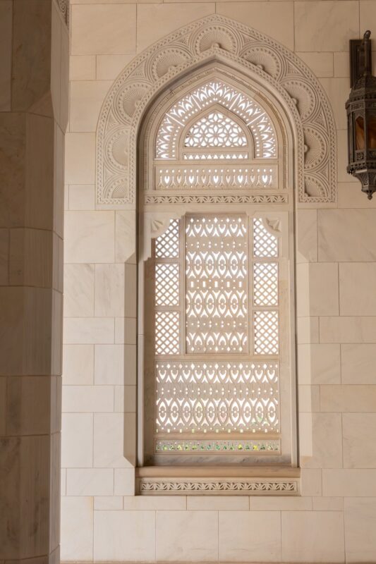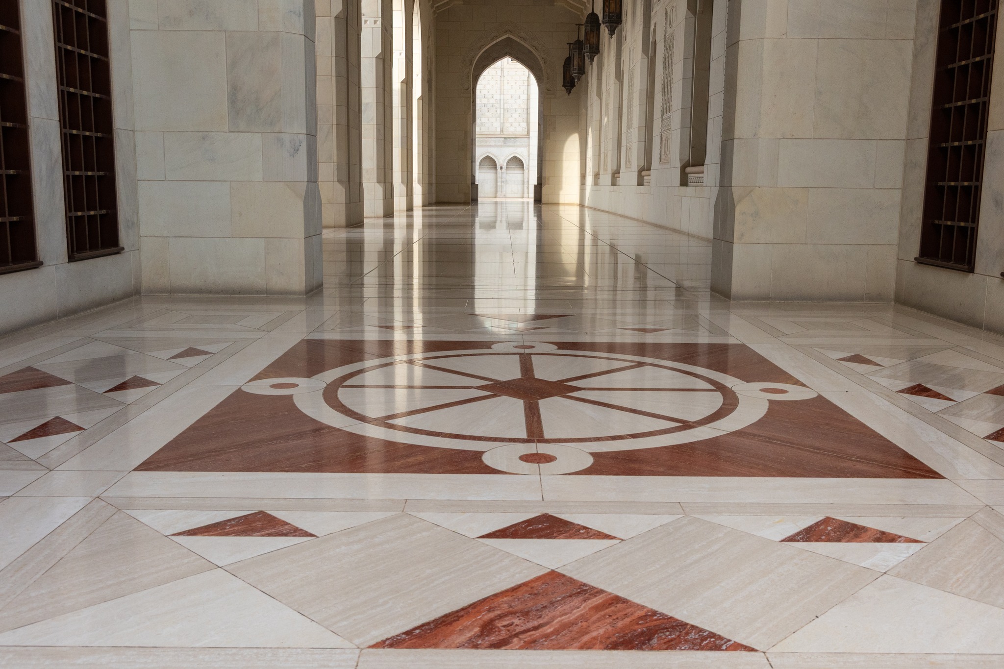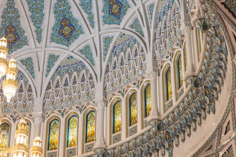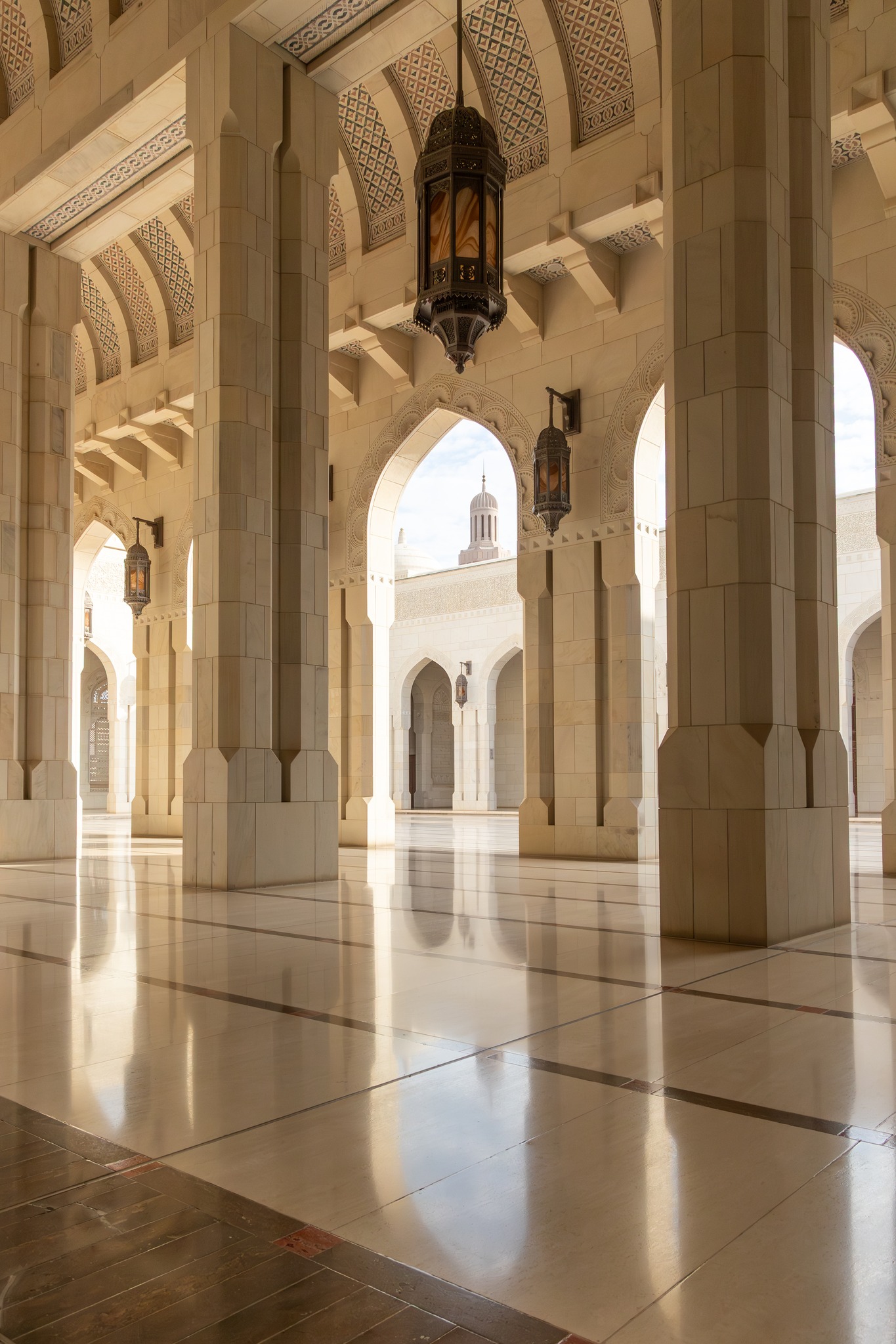 Mošee ise on ilusam kui öö ja päev kokku, avar, mõnusa valgusega, väga head toonid, puhas, meisterlik detailne käsitöö nii vaipades, kivist seinapaneelides, puidust ustel kui kristall-lühtrites. Rahvusvahelise koostöö meistriteos – Iraagi arhitekti visiooni viis ellu Briti peatöövõtja, kasutades Indiast toodud liivakivi, Iraani põrandavaipa, Itaalia valgusteid, marmorit nii eelmainitud riikidest kui Egiptusest ja Omaanist endast. Kohalik on ka puit, mida kasutati uste tegemiseks.